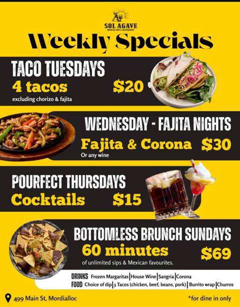 Sol Agave is texmex bar and grill located in Victoria we are serving freshly made finger licking street style Mexican foodWe take pride in using only freshest quality ingredients for creating our Mexican dishes including our in-house fresh salsa and marinates . We serve small and large groups and have different promotions from lunch to dinner . Our wide menu contains entrees tacos burritos salads desserts and much more we also have a kids friendly menu . We also offer wide range of margarita cocktails and frozen margaritas sangria wines and beers. We also have vegan and gluten free options.